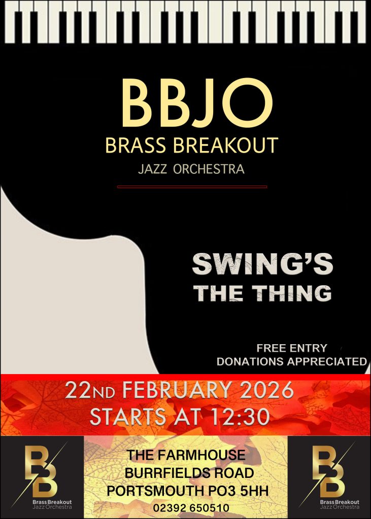 Coming right up 22nd February 2026, starts 12:30 at The Farmhouse BBJO playing to a packed room, get there early if you want a seat. Food served throughout the performance, great bar and nice people. Some new charts as always on this gig featuring outstanding South Coast musicians.